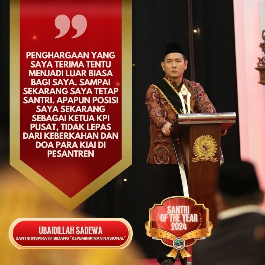 Jakarta, Santriinspirasi.com – Ketua KPI Pusat Ubaidillah Sadewo telah terpilih untuk menerima penghargaan sebagai Santri Inspiratif Bidang Kepemimpinan Nasional dalam ajang Santri of The Year 2024, Minggu (22/09). Acara yang digelar di Gedung Nusantara IV Jakarta tersebut diselenggarakan oleh Islam Nusantara Center (INC) bekerja sama dengan Majelis Permusyawaratan Rakyat (MPR) RI.