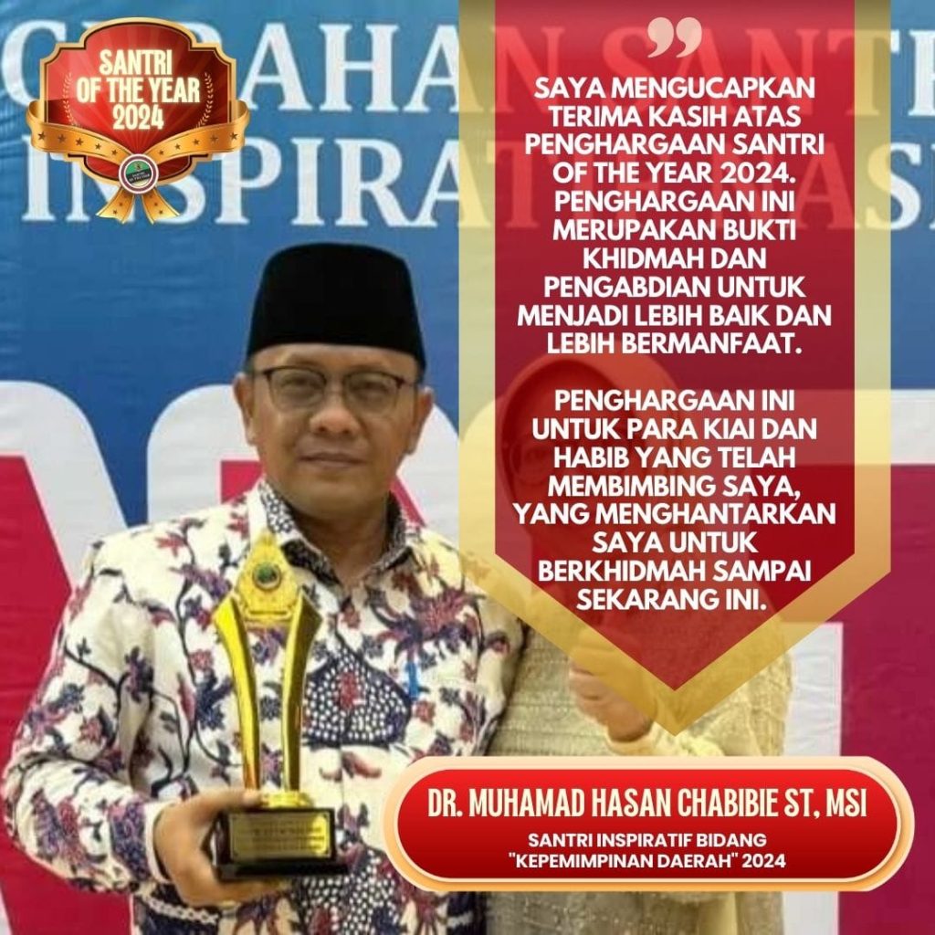 “Saya mengucapkan terima kasih atas penghargaan Santri of the Year 2024. Penghargaan ini merupakan bukti khidmah dan pengabdian untuk menjadi lebih baik dan lebih bermanfaat,” kata Hasan dalam sambutannya di panggung.